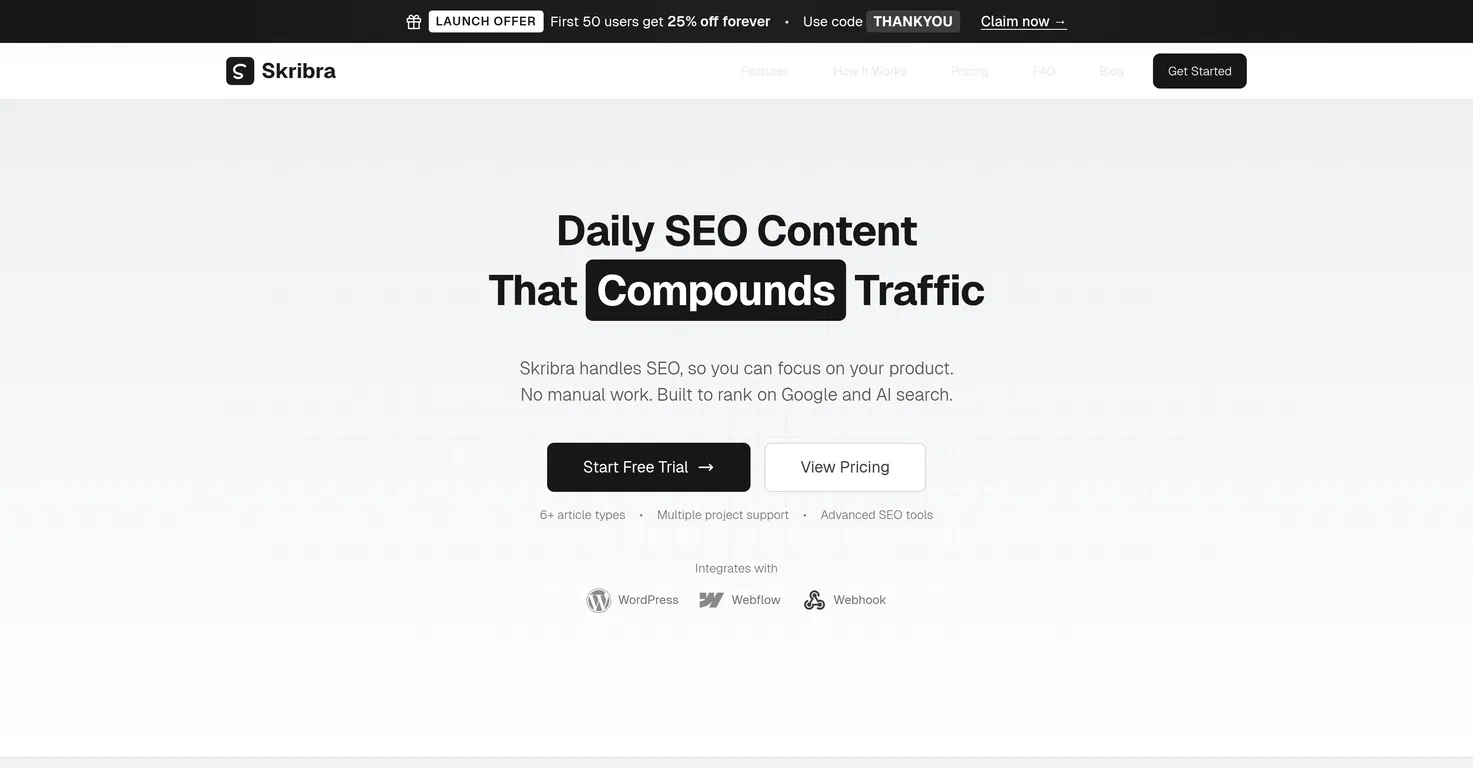 Skribra - это инструмент с искусственным интеллектом, который помогает в автоматическом создании SEO-оптимизированного контента, призванного помочь веб-сайтам занять более высокие позиции в поисковых системах и, следовательно, увеличить веб-трафик.