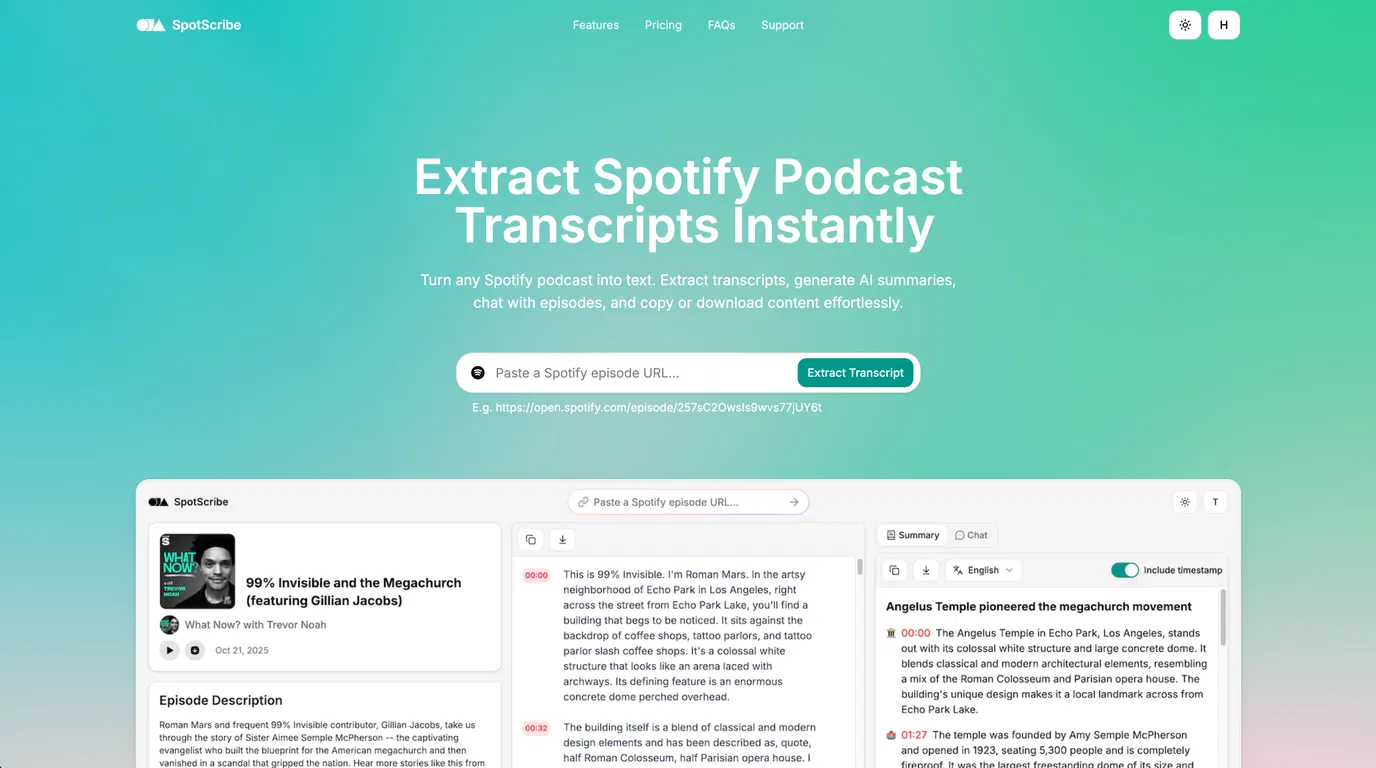 SpotScribe - это инструмент на базе искусственного интеллекта, предназначенный для мгновенного извлечения транскриптов из любого эпизода подкаста Spotify. Пользователи могут преобразовывать устный контент в письменный, обеспечивая эффективную и доступную переработку контента.