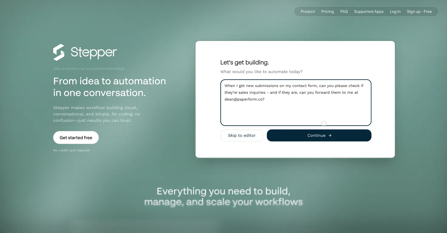 Stepper - это платформа для автоматизации рабочих процессов, основанная на искусственном интеллекте, которая упрощает процесс создания автоматизированных рабочих процессов для вашего бизнеса. Программное обеспечение использует разговорный редактор искусственного интеллекта, который позволяет пользователям создавать рабочие процессы с помощью естественного языка.