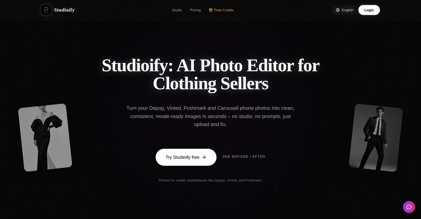 Studioify - это фоторедактор на базе искусственного интеллекта, специально разработанный для продавцов одежды на таких платформах, как Depop, Vinted, Poshmark и Carousell. Его главная особенность - быстрое преобразование телефонных фотографий в чистые, последовательные, готовые к перепродаже изображения, что избавляет от необходимости иметь физическую студию или продвинутые навыки редактирования.