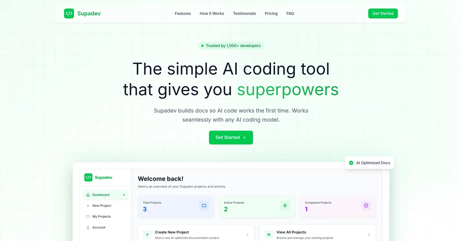 Supadev - это инструмент искусственного интеллекта для кодирования, призванный значительно ускорить разработку и уменьшить количество ошибок при кодировании. Его основная функция - создание исчерпывающей проектной документации, которая помогает помощникам ИИ по кодированию точно понять требования проекта, что позволяет быстрее и надежнее генерировать код.