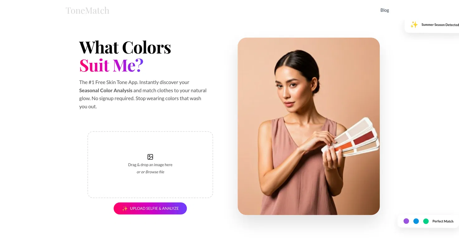 ToneMatch — это бесплатный онлайн-инструмент на базе искусственного интеллекта, который обеспечивает анализ цвета и определение оттенка кожи. Пользователи могут загрузить селфи, и инструмент проанализирует фотографию, чтобы дать рекомендации по наиболее подходящим цветам одежды и макияжа, исходя из индивидуальных природных особенностей человека.