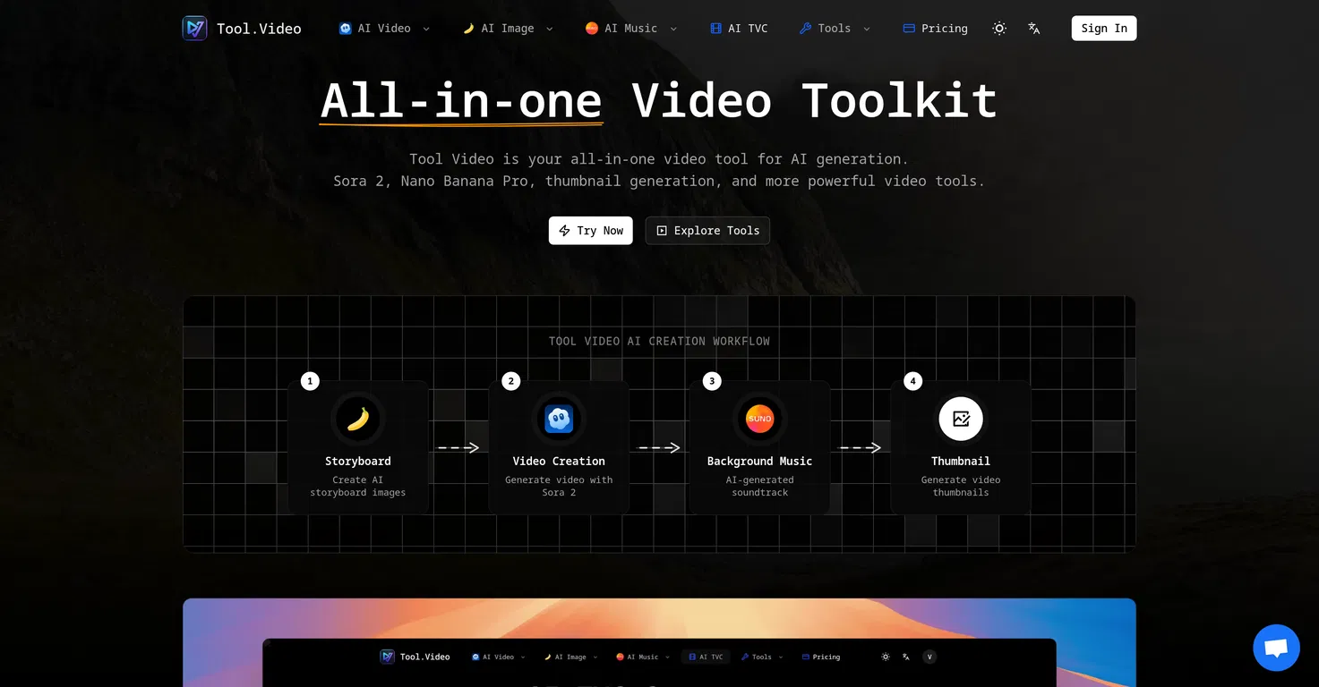Tool Video - это комплексный набор инструментов для создания видео на основе искусственного интеллекта с поддержкой API. Эта платформа объединяет множество инструментов, основанных на искусственном интеллекте, которые призваны облегчить различные аспекты разработки видео.