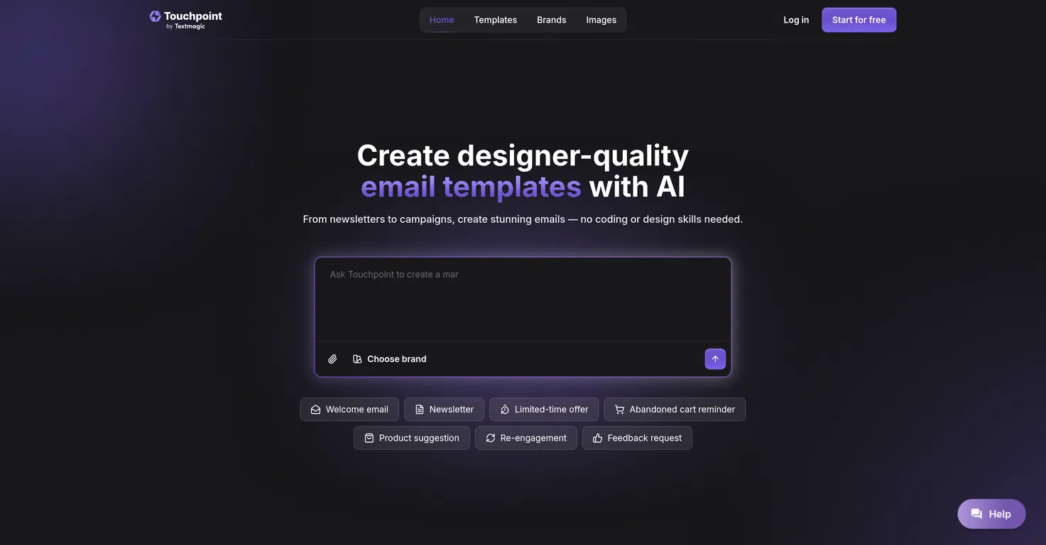 Touchpoint — это инструмент на базе искусственного интеллекта, предназначенный для создания привлекательных и адаптивных шаблонов электронных писем. Этот инструмент, предназначенный для пользователей с небольшим опытом или без опыта в области программирования и дизайна, упрощает весь процесс создания профессионально оформленных электронных писем для различных целей.