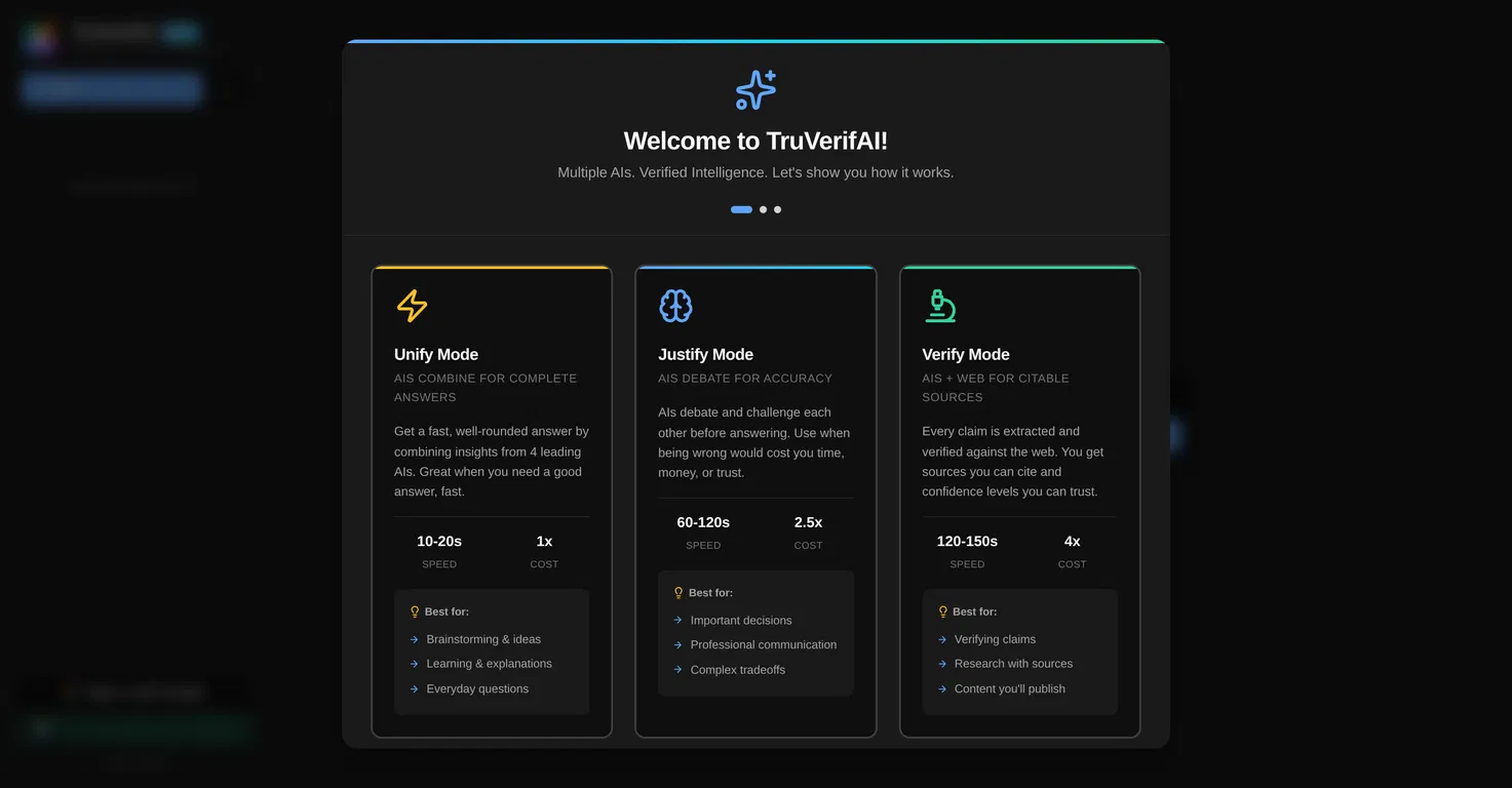 Чтобы удовлетворить конкретные потребности пользователей, TruVerifAI предлагает различные уровни интеллекта - от сбалансированных по скорости и стоимости до ориентированных на точность режимов. Эти режимы включают в себя "Унифицировать", который быстро синтезирует ответы всех моделей ИИ, "Обосновать", который позволяет моделям обдумать противоречивые ответы, и "Проверить", который предполагает использование веб-поиска для получения доказательных ответов.
