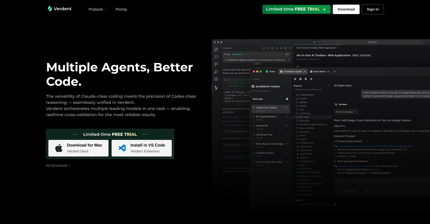 Verdent - это пакет для агентного кодирования на основе искусственного интеллекта, который объединяет несколько агентов для оптимизации процессов кодирования. Доступный для Visual Studio Code, он объединяет различные модели искусственного интеллекта для выполнения задач, обеспечивая перекрестную проверку в реальном времени для получения надежных результатов.