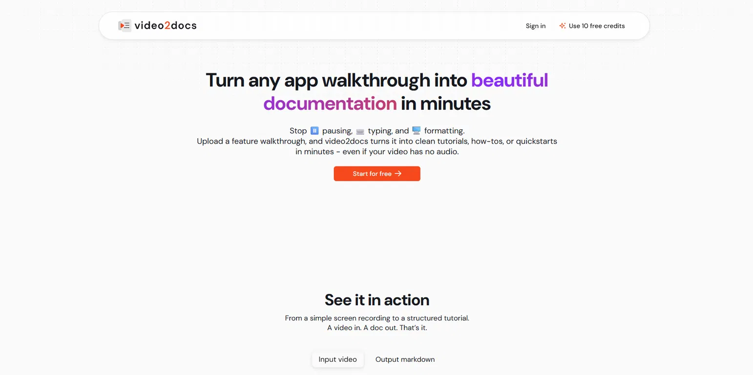 video2docs за считанные минуты преобразует записи экрана в четкую, структурированную документацию. Не требуется расширение для браузера. Просто запишите свой рабочий процесс в Интернете, на настольном компьютере или мобильном устройстве, и video2docs автоматически преобразует видео в контекстно-зависимые пошаговые инструкции, сэкономив вам часы ручного написания.