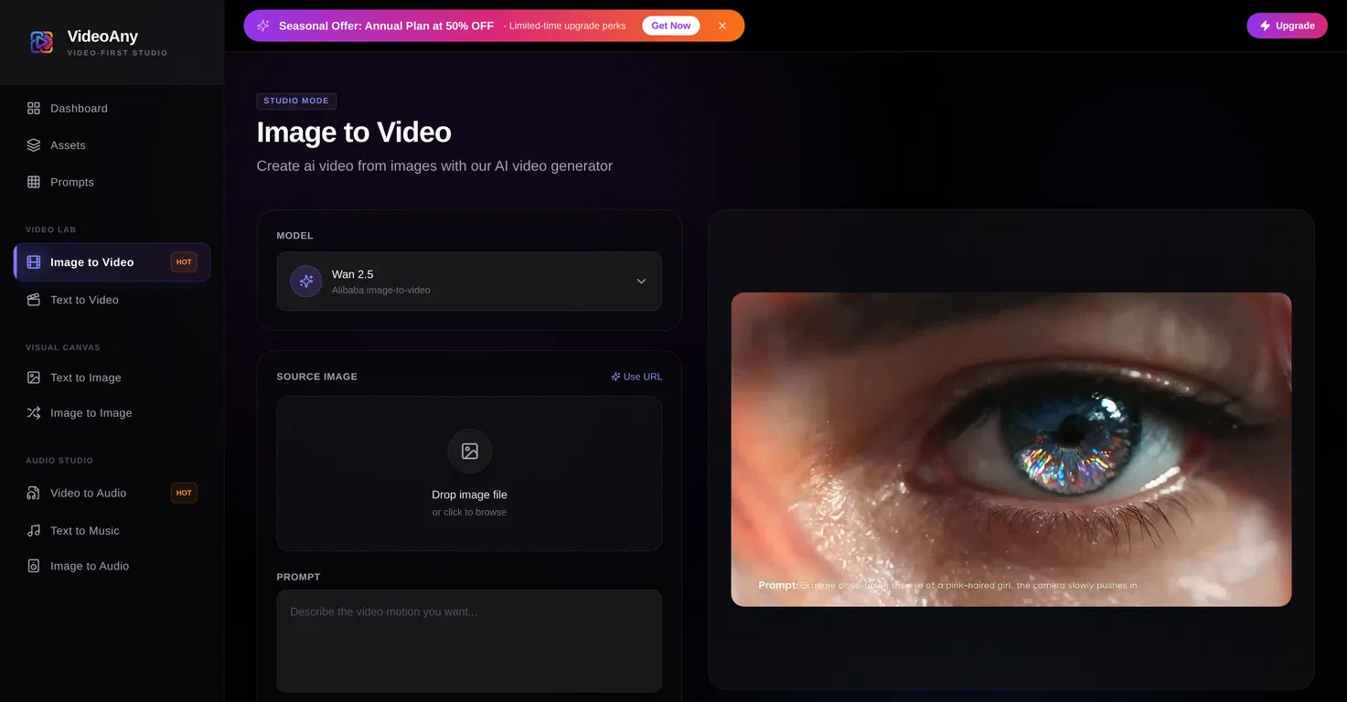 VideoAny's Image to Video AI Generator - это инструмент на базе искусственного интеллекта, предназначенный для преобразования изображений в видео. Он способен анимировать неподвижные изображения, превращая статичные визуальные образы в динамичный контент, подходящий для социальных сетей, рекламы и различных платформ повествования.