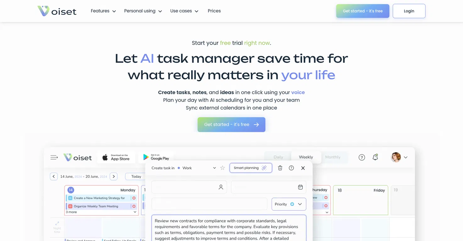 Voiset также предлагает инновационную функцию "Заметки ИИ", которая превращает спонтанные идеи в приоритетные задачи с установленными сроками. Voiset позиционируется как комплексный инструмент для эффективного планирования и управления временем - от отслеживания хобби до управления операциями в растущем бизнесе.