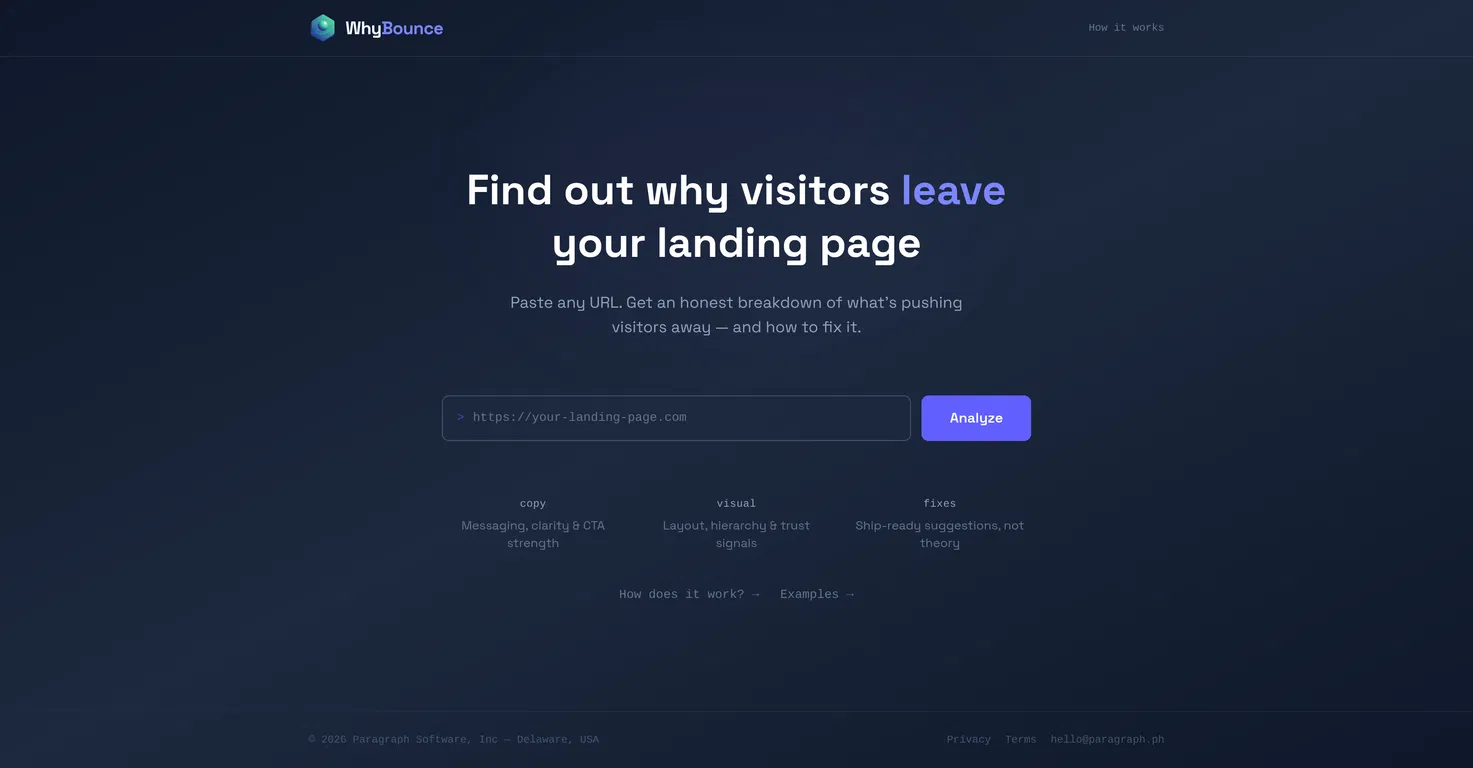WhyBounce - это инструмент аудита на основе искусственного интеллекта, специализирующийся на изучении целевых страниц. Его основной особенностью является способность принимать URL целевой страницы и предоставлять подробный анализ ее производительности, в частности, понимание причин низкого уровня конверсии.