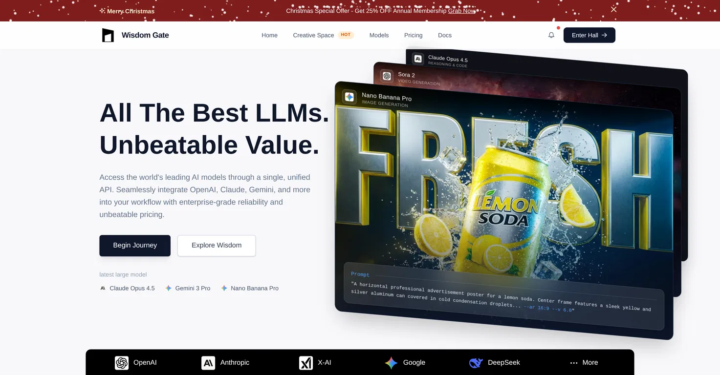 Wisdom Gate служит унифицированным API-шлюзом ИИ, предоставляя единый интерфейс для доступа к множеству ведущих моделей ИИ, включая OpenAI, Claude, Gemini и DeepSeek.