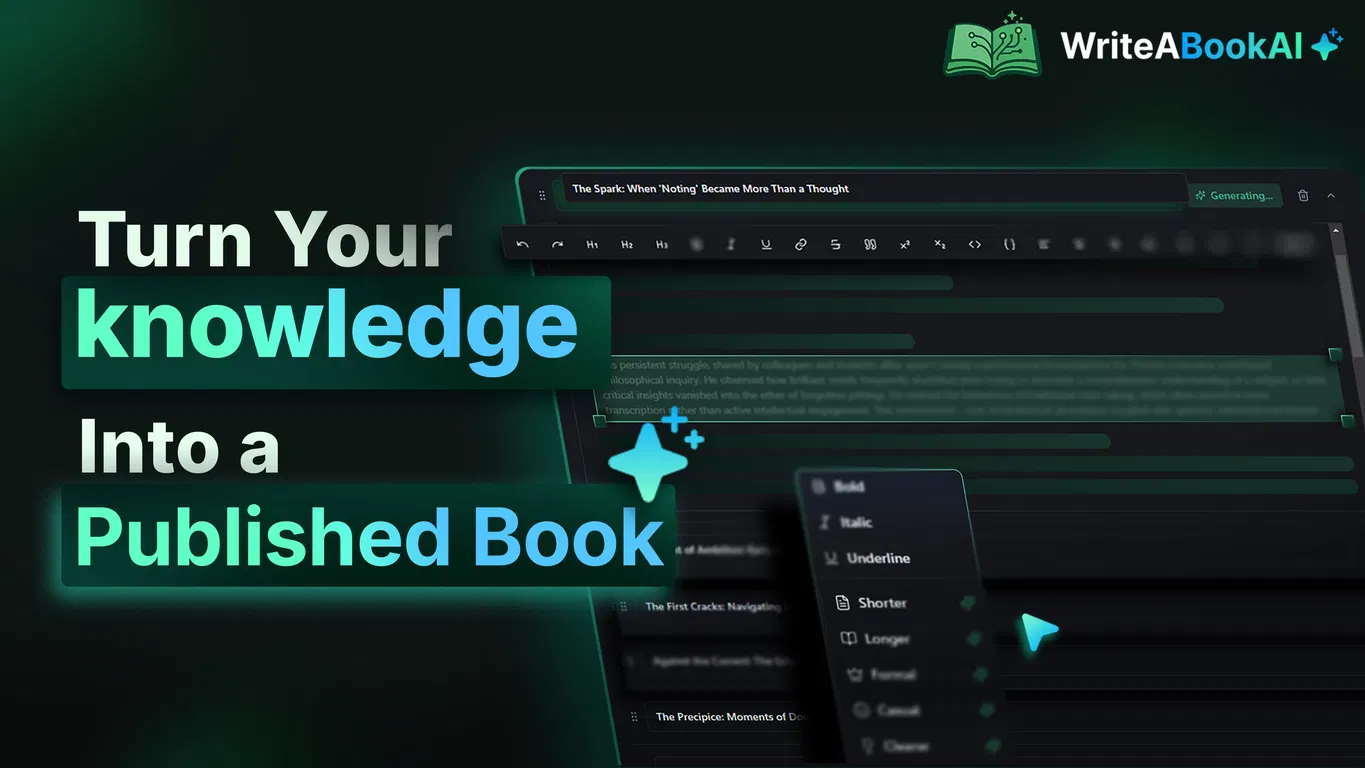 У пользователя также есть возможность доработать любой раздел текста в соответствии с его уникальным стилем письма, улучшив ясность и плавность изложения. После того как пользователь завершит работу над книгой, инструмент способен создать профессионально отформатированную книгу, готовую к публикации.